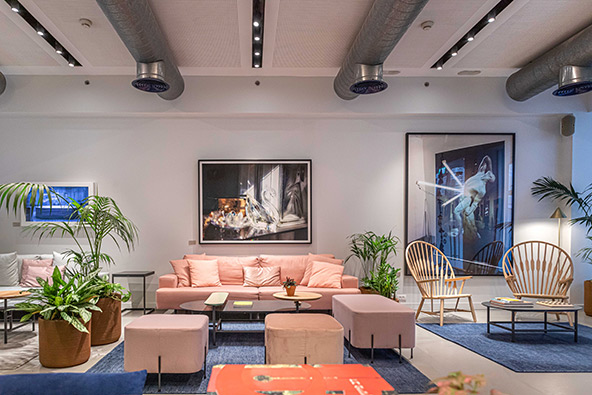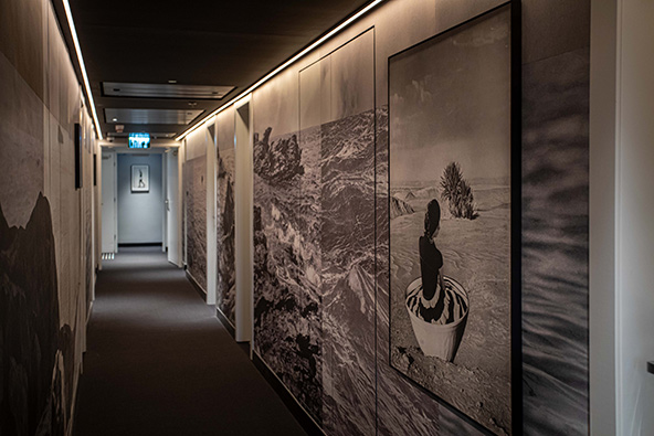 אחרי שמתמקמים בחדר, כדאי לחזור לכניסת המלון כדי לבחון טוב יותר את עבודות האמנות. בכניסה מהרחוב שם מקדמת את פני האורחים עבודת אור של נעמה רוט, שיצרה מבנה מונומנטלי עם פתחים שמתוכם בוקע אור צבעוני, ומזמין את הבאים להתנתק מהרחוב שבחוץ. בלובי, לאורך קיר שלם, מתפרשת עבודה של דנה יואלי, המורכבת ממקטעי בטון היוצרים נוף מופשט של שמש שוקעת אל הים. כדאי גם לעלות ברגל לקומות האחרות כדי לראות על קירות המסדרונות את עבודותיהם של יוצרים דוגמת הילה טוני נוביק, שי זילברמן ומעיין אלקיים.