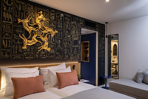 מלון ארטיסט, כפי ששמו מעיד, מוקדש לאמנות ישראלית. בחללים הציבוריים ובחדרי האורחים משולבות יצירות אמנות מקוריות ומסקרנות של אמנים צעירים – לאו דווקא תמונות על הקירות אלא מייצבים גדולים, קירות שלמים שהפכו ליצירות אמנות ועוד. כך, למשל, החדר שבו התארחתי (חדר 110, שווה לכם לבדוק אם הוא זמין בעת ההזמנה) הפך כולו למייצב אמנות של האמן אייל אסולין: קירות החדר צבועים בשחור עם ציורי הירוגליפים, ועל הקיר המרכזי, מעל המיטה, חמישה חתולים מוזהבים בולטים מהקיר, רמז למנהגי הקבורה העתיקים של הפרעונים. התוצאה ראוותנית, מושכת עין ומשמחת כל אוהב חתולים. מעבר לכך, החדר נעים ונוח מאוד, עם מכונת אספרסו, פינת ישיבה מסוגננת שנפתחת למיטה נוספת ומקלחת חדישה ונעימה להפליא.