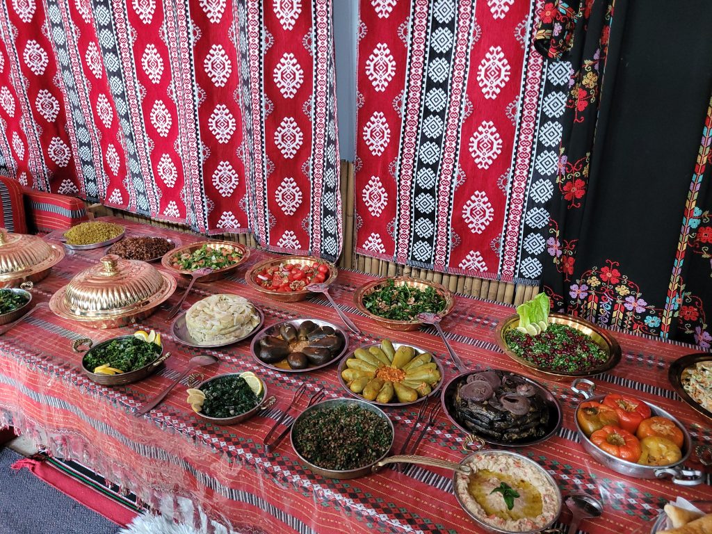 במרומי הר כמון, חצי דקה נסיעה מחוות רום, עיד המארח מקבל את פנינו בזרועות פתוחות ובמאור פנים שניכרים בהם געגועים לאורחים. בחצר המתחם המטופח, בוער טאבון חרס המוסק בגזירי עצים והג'זווה – קנקני הקפה – ממתינים כבר לאורחים. אבל לפני הקפה, באוהל האירוח המרווח הבולט בגוני האדום של שטיחי הדריכה והקירות, אח'לאס, אשת עיד, פותחת שולחן מפואר עשיר במטעמים מהמטבח הבדואי המסורתי, האפוף בניחוחות שעושים לנו מצב רוח טוב ובעיקר מעוררים תיאבון.