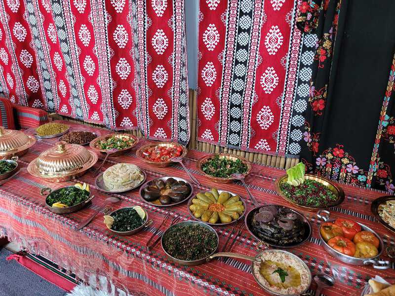 קשה למנות את כל המנות ובכל טעימה יש מעט תסכול מההכרה שלא יהיה ניתן לטעום מכולם: תבשילים וסלטים מצמחי ליקוט עונתיים ישר מן הטבע, כמו חובייזה, לוף ועדשים בשומר בר שידועים בערכיהם התזונתיים, מבחר ירקות ממולאים באורז – ממלפוף, פלפלים צבעוניים, בצלים וקישואים ועד חצילים זעירים, פריקה, סלטים טריים אופייניים לגליל ולמורשת הבדואית ומלך התבשילים – המנסף הבדואי של אורז בבשר כבש או אורז עם עוף.