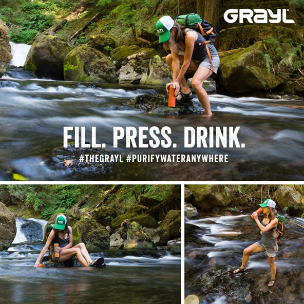 בפעם הבאה שאתם נתקלים במקור מים שאתם לא בטוחים אם אפשר לשתות ממנו, פשוט תטהרו את המים שאתם רוצים לשתות. באמצעות הבקבוק של GRAYL תוכלו למלא מים, ללחוץ, מה שמוביל לפעולת טיהור, ואז לשתות לרוויה.