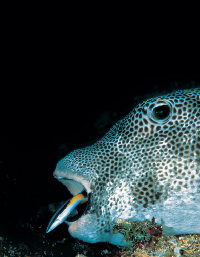 דג נקאי מגיח מלועו של דג גדול ממנו בהרבה, נפוחית הכוכבים. הנקאים הם הקוסמטיקאים של העולם התת מימי והם מנקים בעלי חיים רבים |