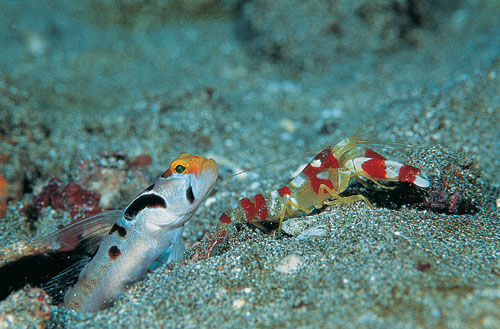 עוד דוגמה ליחסי שיתוף בין מינים באזור השונית היא מערכת היחסים שבין דגים קטנים ויפים הנקראים סרטנונים (מהסוג Cryptocentrus ואחרים) ובין סרטנים הנקראים נקשנים (Alpheus). הסרטן חופר מחילה שבה מתגורר הדג. בדרך כלל יושב הדג בפתח בתצפית ומתריע כאשר מסתמנת סכנה כלשהי. בעת סכנה ממהרים השניים, הדג