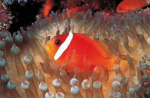 | שושנון העגבנייה (Amphiprion perideraion) בין זרועות שושנת ים בשוניות האלמוגים בפיג'י. לאחר תקופת התאקלמות קצרה, בה מתכסה גופו של הדג בריר גופה של השושנה, הוא יכול לחיות בין זרועותיה. הוא מצדו מגרש כל זר שמתקרב ועלול לנגוס בה, ובנוסף משיג מזון ומבצע עבודות ניקיון |