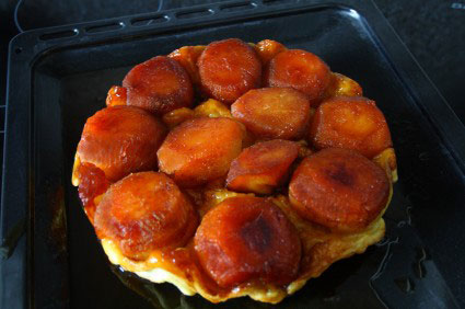 | חומרים: 250 גרם בצק עלים מרודד לעובי שלושה מילימטר. 100 גרם חמאה 210 גרם סוכר 18 תפוחי עץ מסוג דלישס מוזהב מקולפים וחתוכים לחצאים. הכנה: חותכים את החמאה לקוביות ושמים במחבת. מוסיפים את הסוכר ומסדרות את התפוחים בעמידה. את התפוחים שלא נכנסים למחבת אופים בתנור חם במשך עשר דקות, עד שיתרככו. מניחים את המחבת על אש קטנה למשך עשר דקות. אז מוסיפים את התפוחים הרכים שנאפו בתנור. מבשלים עד שהנוזלים מקבלים צבע חום. מורידים מהאש. מכניסים את המחבת לתנור חם למשך שבע דקות. מוציאים ומניחים עליה את הבצק. מקפלים את הצדדים פנימה ואופים במשך כעשרים דקות. לאחר האפייה הופכים את הטארט בזהירות ומגישים בתוספת קרם או גלידת וניל. |