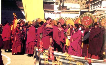 רוחו של הגלגל מנזר לברנג ממוקם בדרום מחוז גאנסו, איזור שהתושבים, טיבטים נוודים, עולים בו בקיץ עם עדריהם אל ערבות העשב הגדולות ויורדים דרכו בחורף לעמקים. החלקים הדרומיים של גאנסו הם ספק טיבטיים ספק סיניים. טריטוריאלית, שלטו הסינים באיזור זה כנראה מהאלף השלישי לפני הספירה. עדויות ארכיאולוגיות לכך מצויות בכמויות נכבדות באזורים המרוחקים רק כמה עשרות קילומטרים מכאן. אך כעת האיזור מאוכלס בעיקר בשבטי נוודים טיבטים, המדברים טיבטית בלבד, בזים לסינית ולסינים ומנסים לשמור על מירב סממני האוטונומיה של תרבותם: דת, לבוש, שפה, מזון, קשרי משפחה ועוד. מנזר לברנג עצום בשטחו. אורכו של המסלול המקיף את המנזר – ה"קורה" – כעשרה קילומטרים, והטיבטים המאמינים נוהגים לבצע הקפות בכיוון תנועת השעון סביב המנזר כולו. את ההקפה הפולחנית הם מבצעים גם סביב כל מבנה בנפרד, והיא מבטאת יסוד בסיסי וחשוב ביותר באמונה הבודהיסטית – הכל מצוי בשינוי מתמיד, בתנועה, במחזוריות. הגלגל הוא הסמל המובהק לכך; ואכן הדְהָרְמָהצָ'אקָרָה, "גלגל התורה", הוא הסמל המושלם של כיתות בודהיסטיות שונות בעולם. על גלגל התפילה בגרסתו הידנית האישית, או בגרסאות המגיעות גם לגובה של כעשרה מטרים, כתובה המנטרה הטיבטנית, "אום מאני פדמה הום", שפירושה המילולי: "אני נותן מבטחי ביהלום שבלוטוס". משמעותה: אני מאמין בכל לבי בשאקיאמוני ובתורה הבודהיסטית. המאמין אוחז בידו השמאלית את גלגל התפילה, יוצא לסיבוב הליכה סביב המנזר, ובידו הימנית מסובב את גלגלי התפילה המקובעים לאורך חומותיו. לחלופין, ניתן לגלגל ביד "מאלה" – מחרוזת תפילה ובה 108 חרוזים. יש לסובב כל חרוז בנפרד, בין אגודל לאצבע, ולומר את המנטרה. המהדרים אינם מסתפקים בהליכה, אלא מוסיפים לצעידה השתטחויות אפיים ארצה ומלמול חוזר של המנטרה. הכוונה בהשתטחות להגיע לידי הנמכה וביטול ה"אני" ולגלות ענווה וצניעות. על המסלול הזה, שבימות חול מצויים בו עשרות אנשים בכל רגע ורגע, נערך הטקס של היום הרביעי החשוב ביותר: ברכה וקדושה למסלול ההליכה. נזירי לברנג מוציאים את ארונות הקודש, את פסלי הטָאטְהָאגָטָה, את דמותו של צוֹנְג־גָא־פָּה, ומובילים את הפסלים במסע של כבוד ויקר סביב המנזר. התהלוכה עצומה. שעות לפני היציאה נאסף המון רב מול אולם הקודש, בו מאוחסנים הפסלים. תזמורת התופים, המצילות והחצוצרות מבקיעה את השמים בתרועה גדולה, וכולם ממתינים לצאת המסע. עם יציאת ראש המנזר העטוי בגלימות קודש בראש המסע נוהרים אחריו ההמונים בריצה. הם דוחפים זה את זה בניסיון להביט מקרוב על הפסלים המכוסים בסוכך. המערביים, לעומת זאת, מנסים לתפוס זווית צילום נוחה, חדה יותר, תוך כדי מרוצה ובתוך ענני האבק שמעלה הטור העצום שמשתרך אחרי הארון. מראה הזוי היום השני הוא יומם של טקסי ריקוד ופיוס הרוחות. עם בוקר מוציאים את הטנקה של בעל ראש השור. גובהה מגיע לעשרה מטרים; קטנה במידה רבה מן הטנקה שנחשפה אתמול לעיני השמש. הקהל מגיח ממשכנות הלילה, אחרי כוס תה של בוקר. סבתות ונכדים, הורים וילדים, מכובדים עטורים בחרוזי אלמוגים ועתירי ברוקרד ושש, ולצידם דלפונים טרוטי עיניים, לבושים בעורות כבש שהשחירו מיושן ומלילות לצד המדורה. הקהל נאסף אט־אט סביב הרחבה שהוכנה מבעוד יום, המסומנת כולה במעין קוד, המציין את מסלולי הפעילות של משתתפי הטקס השונים. הטקס מתחיל קרוב ל־11 לפני הצהריים. השמש קופחת. הנזירים מתיישבים בהיקף הראשון שסביב "מגרש הפולחן", ואחריהם המון רב מצפה בשלווה לקראת הבאות. חלק מהצופים אף טיפסו על מדרון ההר, כדי להשקיף ממרום, ממעוף הציפור, ולתפוס מבט חובק כל על ההתרחשות מתחת. הנגנים, נושאי חצוצרות וקרנות, ונזירי משנה נושאי תופים מעוטרים בראשים מאיימים של יָאמָה נכנסים ומתיישבים במקומות שהוכנו להם מראש. הם יוצרים את האווירה הרצויה באמצעות תיפוף והקשה במצלתיים, לקול זמרה־נהמה מונוטונית, צלילן הייחודי של הזמירות הטיבטיות, הנישא באוויר. סיום כל פסקה מוסיקלית מסומן 