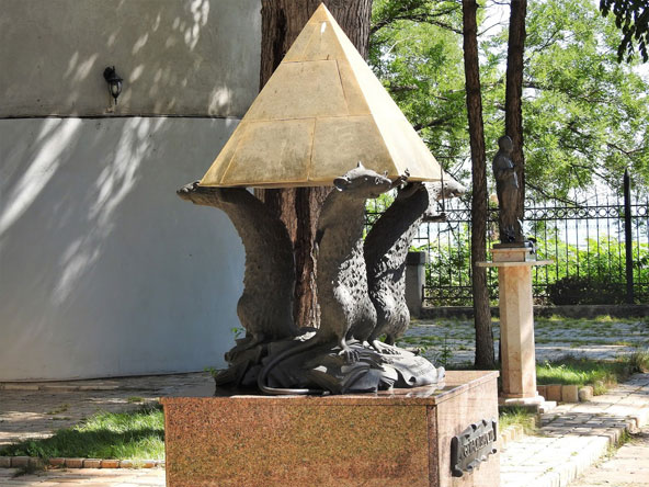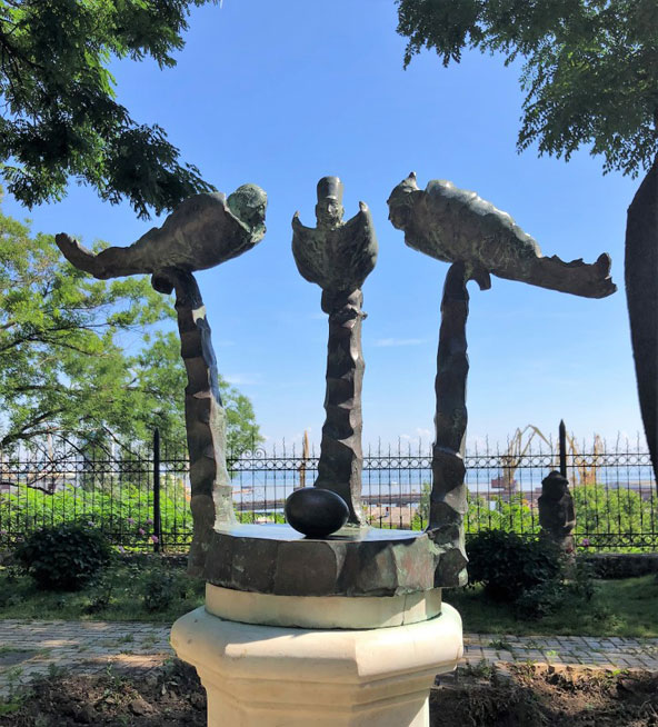 פסל אחר, "ביצה או תרנגולת", הוא מחווה לגאון הבא, או הגאון העתידי (הספרותי?) של העיר. אפשר לראות בו את דמויותיהן הציפוריות של גוגול, פושקין ואיזק באבל מביטות למטה בביצת ענק (ביצת הזהב?) וממתינות לראות מה או מי יבקע ממנה.