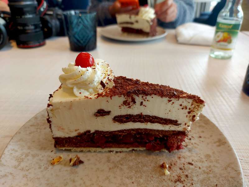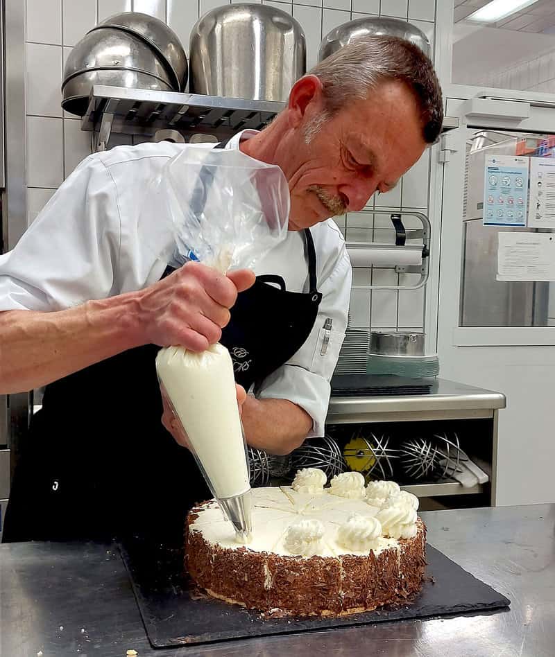סטפן פרי, השף-קונדיטור של קפה הקטורס, עומל על הכנת עוגת היער השחור. בתמונה התחתונה: התוצאה עתירת הקלוריות