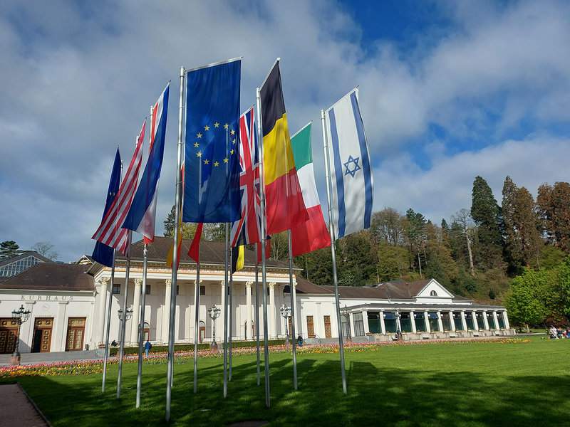 הקורהואס (בתמונה העליונה) והדגלים שלפניו, המעידים על המדינות מהן הגיעו מרבית התיירים לבאדן-באדן, וגם אנחנו על המפה