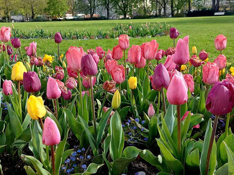 למרות הגשם האביבי שאינו פוסק, אני לא מוותרת על הליכה נינוחה לאורכו של הפארק העירוני שמשני צדי נהר האוס, שכאן נראה יותר כמו נחל מקסים מאשר כנהר שוצף. עצים גדולים נטועים בשתי גדותיו, משטחי דשא מנוקדים בפרחי בר ענוגים, כמה ברווזים שוחים בנהר או משכשכים בשלולית שנקוותה לצדו, פה ושם פזורות ערוגות של צבעונים שפורחים בעונה זו במלוא יופיים, עצי מגנוליה מטשטשים את החושים בפריחה ורודה משגעת. להשלמת המראה הפסטורלי מצטרפים גשרים מסוגננים שנמתחים מעל הנהר ומאפשרים מעבר מגדה אחת לשנייה, וחוזר חלילה.