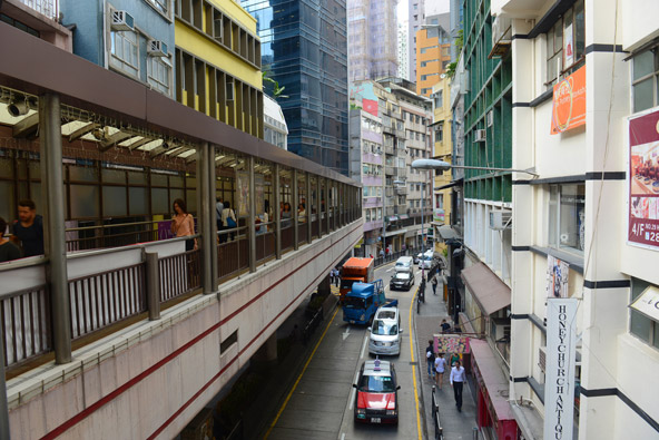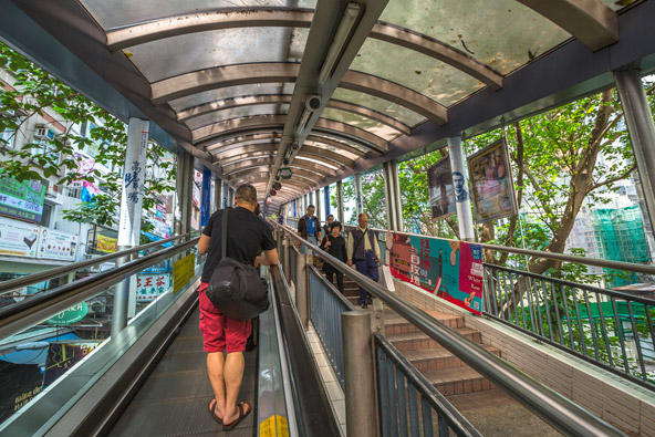 • ללכת על הגובה: למבקר בפעם הראשונה מצפה הפתעה – האי הונג קונג הררי מאוד וירוק מאוד. מלבד שניים-שלושה רחובות הסמוכים לנמל, העיר מטפסת על גבעות והרים, כך שהרחובות המאונכים למפרץ תלולים מאוד, ושרירי הרגליים עובדים שעות נוספות. כדי לפתור את העניין וגם להתגבר על הגשמים היורדים תדיר לאורך כל השנה, נבנתה בהונג קונג מערכת של גשרים מקורים העוברים מעל הרחובות התלולים ומובילים אל גולת הכותרת – סדרה של מדרגות נעות, או ליתר דיוק מדרכות נעות, מהסוג שיש בנמלי תעופה, שעולות מעלה-מעלה וחוסכות את מאמץ הטיפוס הרגלי. המדרכות הנעות האלה, שנקראות mid-level escalator, אוחזות בתואר המדרגות הנעות הארוכות בתבל. איך זה עובד? מתחילים בסנטרל, השכונה הכי קרובה לנמל, אזור העסקים של הונג קונג עם גורדי שחקים חדשניים וחנויות יוקרתיות, עולים על אחד הגשרים מעל הרחוב ומתחילים ללכת לכיוון המדרגות הנעות (אם אתם מתבלבלים בדרך, פשוט בקשו עזרה – המקומיים מדברים אנגלית מצוינת והם שמחים לעזור לתיירים נבוכים, לעיתים, כפי שגיליתי, הם ילכו אתכם לאורך כל הדרך כדי לוודא שהגעתם בשלום אל היעד).