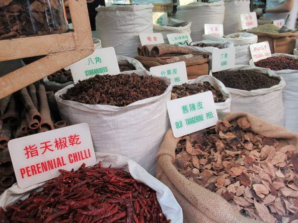 תבלינים בשוק שכונתי קטן. לאן שלא תלכו, תגלו שוק מקומי, דוכני אוכל ואינספור מסעדות