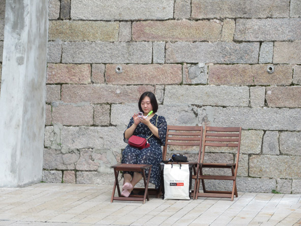 מבקרת במרכז התרבות והאמנות Tai Kwun נחה ליד חומת בית הסוהר לשעבר