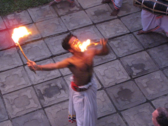 ושוב ממשיכים בנסיעה. אני מתקשה להתרגל לכך שהנסיעה כאן היא בצד שמאל של הכביש, מזכרת מהשלטון הבריטי. אינספור פעמים רגלי נשלחה באופן אוטומטי לעבר דוושת בלם דמיונית, כאשר נדמה לי שהרכב המגיע ממול עומד להיכנס בנו… אנחנו בדרכנו לפסגת מקדש הזהב בדמבולה (Dambulla). עולים ועולים, והעלייה אינה מסתיימת. אך הסוף מפצה על הכל: מראה נפלא של המישור שלמרגלות המקדש נפרש מתחתנו. גם במקדש עצמו יש הרבה מה לראות. למעשה, זהו מתחם ענק של מערות טבעיות, שבתוכן ספונים עשרות פסלי בודהה וציורי קיר מרשימים, שקשה להבין כיצד השתמר עושר הצבעים שלהם. דרכנו לעיר קנדי (Kandy) חולפת על פני יערות טרופיים, מטעי קוקוס ענקיים, גידולים חקלאיים שונים ומגוונים. קנדי, עיר קדושה השוכנת בין גבעות ירוקות, לחופי אגם ציורי מעשה ידי אדם. להפתעתי אני מגלה עיר תיירותית, עם מגוון בתי מלון ושירותים שונים לתייר. הנהג ממליץ לנו לצפות במופע פולקלור אותנטי, ואני, סקפטי מטבעי, זקוק לשכנוע ארוך. אם להודות על האמת, אני שמח שהשתכנעתי: המופע מרהיב, עם שלל צבעים וזמירות ששאבו השראה מטקסי פולחן עתיקים, ושיאו של המופע בסופו – מופע אש והליכה ברגלים יחפות על גחלים רוחשות.