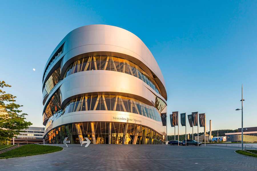 אם המבנה של מוזיאון פורשה נראה לכם חדשני, חכו עד שתראו את מוזיאון מרצדס-בנץ. המבנה, שניצב בפתח מפעל הרכב דיימלר, יצרנית מרצדס, נועד לדמות צורה של מנוע ונקל (המוכר גם כמנוע מוטורי), ונראה כמו סליל בעל שלושה מעגלים חופפים. בצד אחד של הבניין נמצא המוזיאון ובצדו האחר אולם מכירות. מוצגות פה כ-160 מכוניות מרצדס, מהדגמים הראשונים ועד למכוניות העתיד.