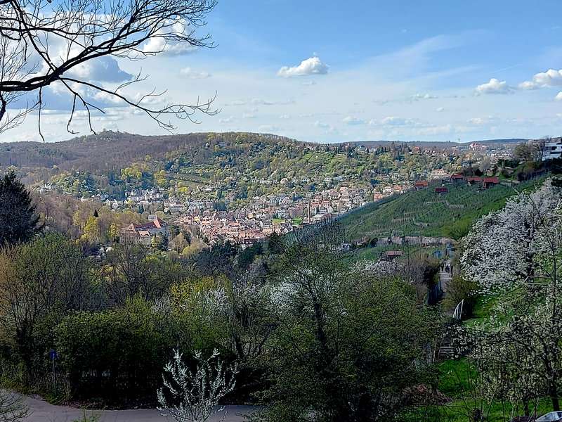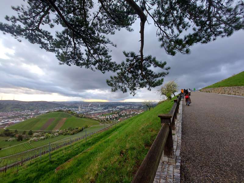 מכאן יוצאים כמה מסלולי הליכה, הארוך שבהם מקיף את העיר כולה, אורכו 54 ק"מ והוא מסומן בסימון שבילים בדמות סוס. אנחנו בחרנו באתגר קל יותר – שלושה וחצי קילומטרים בשביל שנקרא "הגרב הכחולה", Blaustrümpflerweg בגרמנית, שכצפוי אכן מסומן בגרב בצבע תכלת. המסלול המלא, באורך שבעה וחצי קילומטרים, מתחיל ומסתיים בבית קברות בלב היער, ואם אתם לא נרתעים ממקומות כאלה, בהחלט כדאי לשוטט בו. השביל, שמציע תצפיות נפלאות על שטוטגרט, מוביל אותנו לעוד כלי תחבורה ציבורית ייחודי – רכבת חשמלית שיורדת בתלילות מסמרת שיער בפיתולי הרחוב מראש הגבעה אל כיכר מריאנפלאץ המקסימה שבמרכז העיר. בדרך אפשר לראות עוד מהנוף המקסים.
