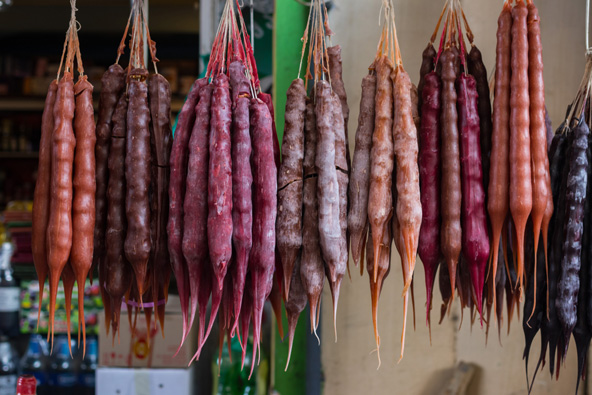 שרשרות של צ'ורצ'חלה, הממתק המקומי העשוי מאגוזים טבולים ברכז ענבים