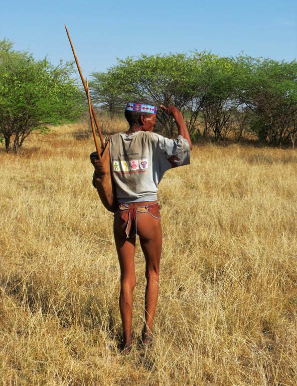 וכך, כל בוקר יצאנו למסע ציד יחד עם סטיב קונטא, אולד מן גאו ובו, מלווי נשק בגובה 155ס"מ, לבושים בלבוש רגיל לחלוטין (הם לא התחפשו לעירומים בשביל התיירים). על הגב קשת, כידון ומוט חפירה. על האדמה הראו לנו את עקבות הצבוע, הברדלס, הפיל ומיני אנטילופות שהסתובבו סביב המחנה. כשזיהו חיה, שאנחנו בדרך כלל בכלל לא הצלחנו לראות, מיד לקחו מעט חול ובדקו את כיוון הרוח. למרות שבדרך כלל הנשים הם הלקטות והגברים הם הציידים, אין מצב שהגבר יזהה אגוז, פרי או שורש מאכל או למשקה ולא יעמול, לעיתים יותר משעה, כדי להוציאו מהקרקע ולהביאו לבני משפחתו.
