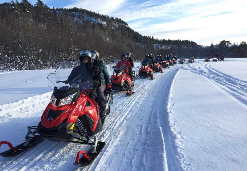 רכיבה על אופנועי שלג על נהר קפוא ובשבילי היער, מקפיץ את האדרנלין שבגופינו לרמות על. אחרי שיעור קצר על בטיחות ונהיגה זהירה, אנו מתחילים את המסלול על משטח קרח עצום בעובי של יותר ממטר שמתחתיו זורם לו הנהר. כעבור קילומטרים אחדים מסמן המדריך הנוסע בראש הטור לפנות ימינה ונכנסים למעבה היער. שם בין העצים, נח לו מעטה לבן נוצץ בשמש שמציצה פה ושם ונראה כמו פיזרו עליו אלפי קריסטלים נוצצים. עוצרים למנוחה ולדייג, כי מסתבר שבנהר מתחתינו שוחים להם בנחת דגים וכמנהג הלאפים, קודחים במקדח ידני חור בקרח ומשלשלים לתוכו חכה וממתינים בשלווה. אם התמזל מזלנו ולא התמזל מזלו של הדג, הוא יתפס בחכה ויועלה אחר כבוד מעל פני הקרח.