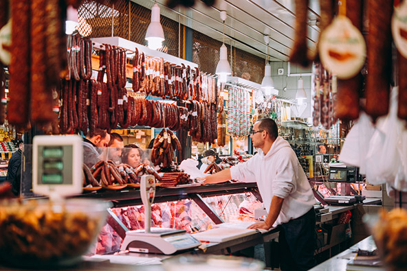דוכן נקניקים בשוק המרכזי של בודפשט. הקונים הם שילוב של תיירים ומקומיים | צילום: Yulia Grigoryeva / Shutterstock.com
