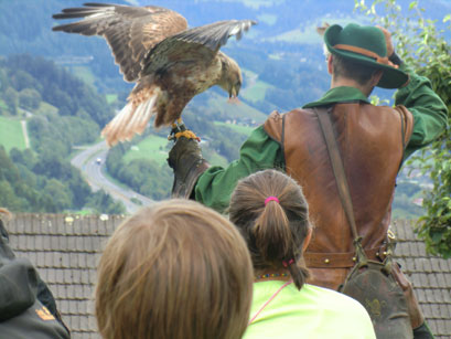 משם אנחנו ממשיכים בנסיעה קצרה לטירת הוהנוורפן (Hohenwerfen) על הכביש צדדי לאורך נהר הזלצאך (Zalzach), שחותך את ההר ויוצר קניון יפהפה וסוער, כאשר מרחוק כבר רואים את הטירה היפה של הוהנוורפן. אנחנו מגיעים לטירה, חונים במגרש חניה וקונים כרטיסי כניסה שכולל נסיעה הלוך-חזור במעלית ומופע עופות דורסים. לסיור אנחנו נכנסים חינם עם כרטיס זלצבורגלנד. עלינו במעלית בשיפוע חד לטירה, שם מיהרנו למופע העופות שכבר החל. עשרות מבוגרים וילדים ישבו על הדשא וצפו בעופות: נשר, עיט, ינשוף ואחרים, עפו מעל הקהל, תופסים באוויר אפרוחים קטנים חיים שהמאלפים זרקו להם לאוויר. המאלפים, הלבושים במדים של לוחמים מוסקטרים, חילקו הוראות במיקרופון לעופות (בגרמנית, כמובן). כולם מיהרו לצלם, אבל כשצילמתי את הנשרים במעופם וקיבלתי בעיקר תמונות של שמיים ריקים… אבל כאשר הם חזרו ועמדו על המאלף הצלחתי לתפוס איזה נשר.