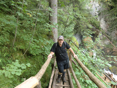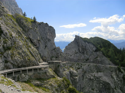 התחלנו את הטיפוס עם הקרוואן בדרך מתפתלת שעלתה בתלילות אל הרכס. כשהטירה של וורפן מתחתנו, טיפסנו לאט בסיבובים עד לחניה, שם שתי ילדות אוסטריות יפיפיות כיוונו אותנו לחנות את הקרוואן. מהחניה מתחילים לטפס ברגל בכביש בשיפוע תלול עד כמעט ייאוש, ואז רואים את שער הכניסה ("הנה הרכבל שעולה למערה", אני חושב בתמימות). אנחנו נכנסים למבנה מפואר, שבו נמצאת הקופה. כשמתברר לי ששכחתי את שובר ההנחה בקרוואן (אין סיכוי שאחזור את הדרך הזאת שוב בשביל הנחה של ארבעה אירו), היא אומרת בחיוך שהיא מאמינה לי, ואנחנו משלמים 34 אירו לשני מבוגרים. מרוצים, אנחנו יוצאים מהמבנה רק לגלות שלט האומר כי יש טיפוס של 20 דקות לרכבל ועוד 20 דקות מהרכבל למערה. בלית ברירה אנחנו מתחילים לטפס – אם חישוב הזמן כאן נעשה כמו במקרה של המפלים, אני מניח שהאוסטרים שלחו צוות טיפוס אלפיני מיומן, שעשה את הדרך בריצה קלה…. לנו הטיפוס לוקח, עם הפסקות להסדרת הנשימה, יותר מחצי שעה של עלייה חדה (כולל מנהרה אחת). בסופה של העלייה אנחנו עוצרים לגלידה בית קפה ומשם לרכבל שמטפס בשיפוע חד לאורך המצוק (לא המצוק האחרון, לצערי). בסך הכול שלוש דקות של נסיעה במהירות אדירה ואנחנו למעלה.