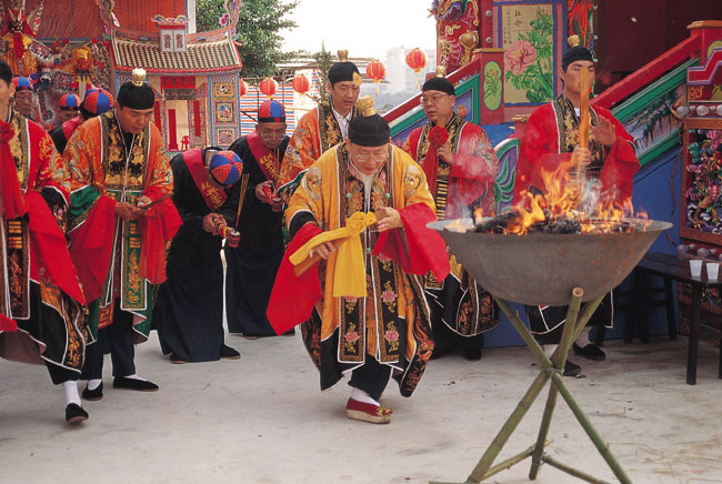 טקסים שונים נערכו בעת ובעונה אחת: נזירים בודהיסטים שרו מזמורים למען ישועת כל היצורים החיים, כוהן טאואיסטי ערך טקס לזימון האלים, ומדיום לבוש בגדים מסורתיים ומאופר בכבדות חיקה את זונג קווי (Zhong Kuei), אל סיני המגרש שדים. בתום הביצוע של ריקוד מורכב נכנס המדיום למצב טראנס, שבו הפך, על פי האמונה, לישות אלוהית. הוא הניד את עפעפיו ומלמל דברים לא ברורים, עד שבשלב כלשהו הציע לאל מנחה של אווז ותרנגול. בעודו בטראנס תלש בשיניו את כרבולתו של התרנגול, ירק אותה לעבר הקהל ואז השליך את התרנגול ההמום לרצפה.