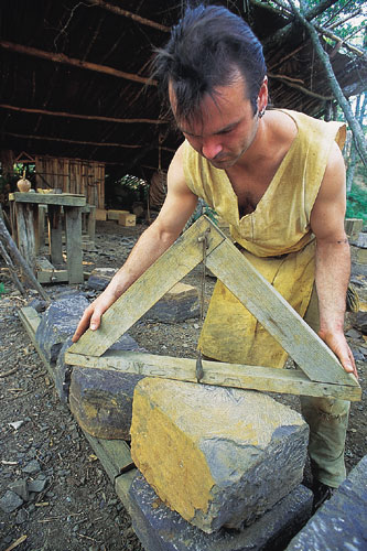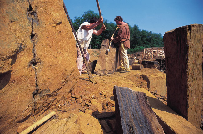 בתי המלאכה, שנבנו מעץ ואבן, פתוחים כלפי ה"רחוב". הנה הלוז' (הלשכה) של סתתי האבן. בימי הביניים, תקופתם של הבנאים הדגולים, בוני הקתדרלות והטירות, היו הבונים מאוחדים באגודה של עובדים שאינם כפופים לאיש, שלה סודות וחוקים פנימיים. מכאן שם המסדר "הבונים החופשיים" ומערכת הסימנים המסתוריים שעדיין מאפיינים את חברי הלשכות של ימינו. הם חוצבים אבנים, חותכים ומסתתים אותן. כל חרש אבן מסתת שלוש אבנים ביום. על כל אבן רושם האומן, בסימנים מוסכמים, את שמו, מספר המסמן את הנדבך שלו היא מיועדת ואת מיקומה בנדבך.