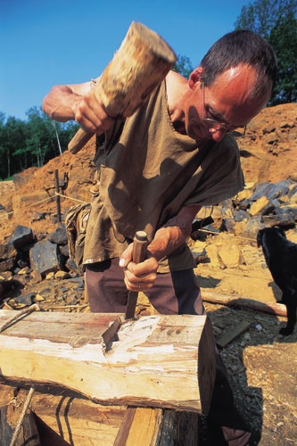 כלי העבודה מיוצרים כולם במקום על פי דגמים ושיטות של ימי הביניים, וכפי שנהוג היה אז, אתר הבנייה הוא כמעט משק אוטרקי. מדובר בעיקר בכלי ברזל, כך שהאומן החשוב ביותר הוא הנפח, הבונה את הכלים ומתקן את אלה שנפגמו במהלך העבודה. איתו פועלים סתתים, בנאים ומגישי מלט המטפסים על הסולמות, אומני עץ, שוזר החבלים, הקדרים ולבסוף כורתי העצים, הגחמונים (יצרני פחמים), העגלונים והסבלים.