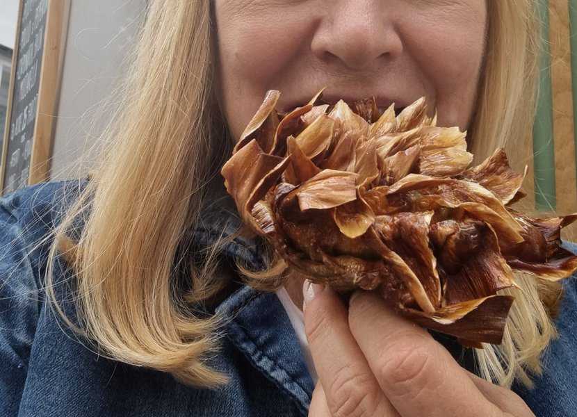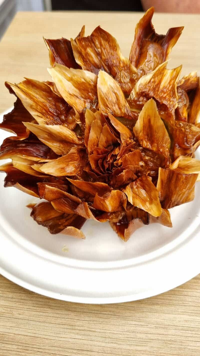 בדוכן 66 FOOD BOX בחרתי בקרצ'ופי אה לה רומנה שמכונה גם ארטישוק יהודי בטיגון עמוק. במטבחון הזעיר וחיכיתי חסרת סבלנות עד יטגנו אותו בשמן עמוק כחמש דקות. העלים הופכים לצ'יפס פריך בטעם כייפי.