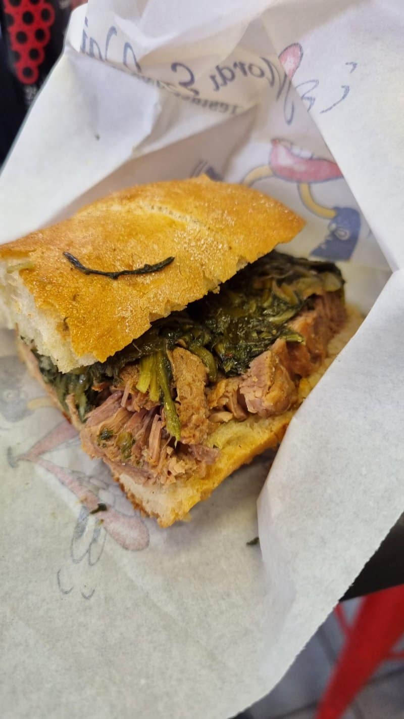 Mordi e Vai BOX 15, הדוכן של הקצב האגדי שהלך לאחרונה לעולמו הוא מהמבוקשים בשוק קודם כל קחו מספר והמתינו בסבלנות בתור, זה שווה את טעם הביס המושלם. אתמול הייתי מס' 87 והיום נסים דואג לנו ואנו עוקפים את התור. העובד בדוכן פורס את הפוקצ'ה הפריכה, מרטיב בנדיבות פרוסה אחת מהרוטב של נתח הבשר המבושל ומערים תוספות. בדוכן אחר העזתי לטעום "טריפה" (קיבת פרה Trippa alla Romana) שממלאים כאן בכריך ברוטב עשיר שבו בושלה.