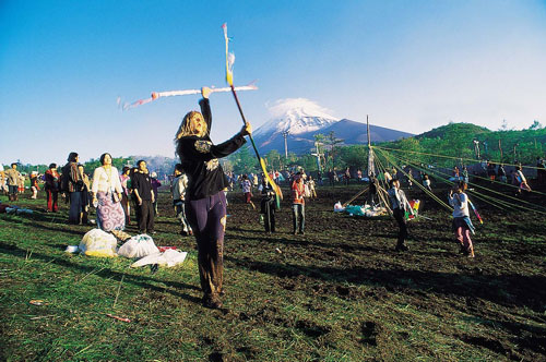 | למרגלות הר פוג'י, יפאן. הג'אגלרים מפליאים בלהטוטים עם מקלות אש ברגעי השיא של הלילה. חושך, אש, מוסיקה, סמלים הודיים וטקסים פגאניים |