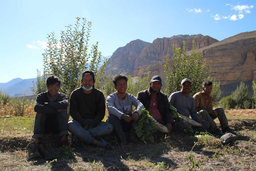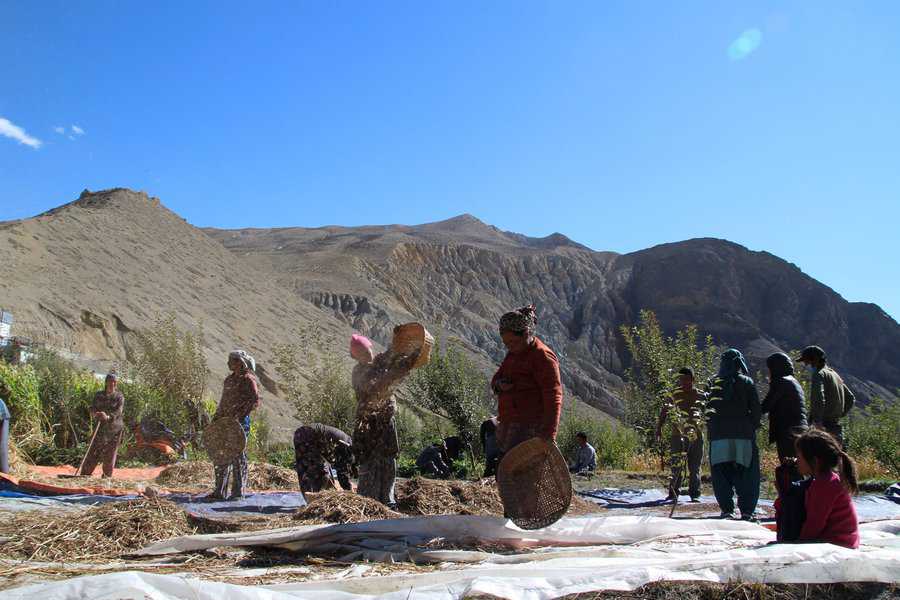 הכפר הראשון שישנו בו הוא צ'וסנג (Chhusang/Chhuksang). הלכנו שעות ספורות אך הכפר ואנשיו שבו אותנו והחלטנו להישאר; מטעים של תפוחים ושדות תירס בין צוקים אדומים והרים של שלג ומדבר. את הגעתנו ליוו שריקות שלא הבנו תחילה את משמעותן. יותר מאוחר התבררו לנו כקריאות של נשות הכפר לבואה של הרוח, קריאה לעזרה במלאכת הפרדת המוץ מהבר. כולם בשדות; קיץ, מתאספים יחד לקצור את התבואה. עושה רושם שהנשים מנהלות את העניינים, זורקות הוראות זו לזו בטון סמכותי, סוחבות, מזיזות. הגברים יושבים בצד, מדברים, משועשעים. קבוצה אחרת של תושבי הכפר מפוזרת במטע תפוחים סמוך, הם קוטפים תפוחים וסוחבים אותם לכפר, גם ילדים.