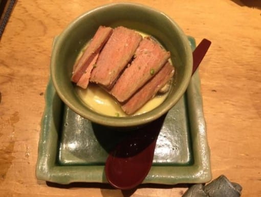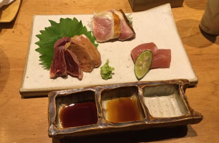 ואז הוגשה המנה המאתגרת: חלקי עוף לא מבושלים. נתחים קטנים של בשר אדום פרוסים כמו סאשימי ולצדם מעט מלח. פיסות שוק עם השומן והעור הצרוב עם רוטב שלא הצלחתי להבין מהו. כבד לבן מצוין ופיסות לב ברוטב סויה. מנה מעניינת מאוד, חדשה לי לגמרי. יש סיכון בנתחי עוף לא מבושלים, אבל כולם אוכלים את זה, אם כי לצדי ישב סועד שלא טעם מהכבד החי. ואכן, הטעימה לא גרמה בהמשך לשום מיחוש. השאלה שנשאלתי לא הייתה בריאותית או גסטרונומית: היא בתחום התרבות. אפשר לשער שהעופות אינם נגועים בחיידקים ושהמסעדה יודעת מה היא עושה, ואין סכנה. בישראל לא הייתי מסתכן.