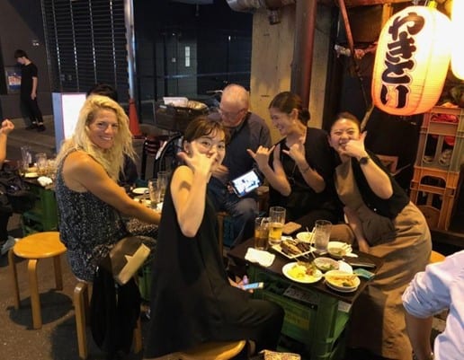 התיישבנו במסעדה הראשונה שמצאנו בה מקום ברחוב. נעים יותר מאשר בפנים. יושבים על כיסאות נמוכים מאוד, ליד שולחנות קטנים. הזמנו את כל המבחר שבתפריט הקטן, חלקי פנים וחלקי חוץ, שהיו בסך הכל טובים ועסיסיים וכמה מהם קשים משהו. התרועענו עם שלוש בנות יפאניות חמודות שישבו לידינו, טעמנו מהצלחות והכוסות שלהן, הן משלנו, הצטלמנו, צחקנו, החלפנו כתובות דוא״ל והתכתבנו בו במקום. זה היה ערב חביב מאוד, במזג אוויר נפלא. שילמנו 8900 ין לשלושה סועדים ומעט כיבוד לבנות, כ-295 ₪. מטרו (Yurakucho).