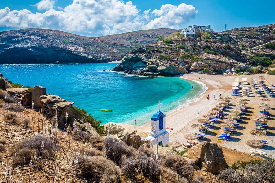 חופים: אחד החופים הפופולריים האי הוא חוף Koundouros, חוף ציורי ושליו המרוחק כ-18 ק"מ מעיר הבירה. חוף Otzias השוכן בנקדה הצפונית ביותר באי הוא חוף רחב ויפה עם מים צלולים, המוצל בעצים. חוף Orkos הוא חוף רחב, שקט ומבודד בצפון-מזרח האי, שמימיו הצלולים הופכים אותו למושלם לשחייה ולשנירקול.
