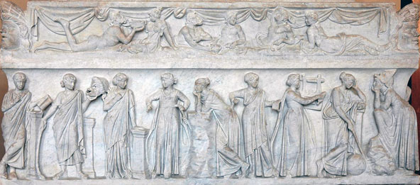 בשירתן המוזות יצרו מציאות מדומה וצבעו את החיים בוורוד. יכולתן להקנות שמחה בלב אדם היתה לעיתים מראית עין בלבד. אדם ששמע את שירת המוזות שכח את צרותיו ואת המציאות המחכה לו מעבר לפינה.  דמותן של תשע המוזות על סרקופג (ארון קבורה עשוי מאבן) מהמאה ה-2 לספירה. מאוסף מוזיאון הלובר בפריז
