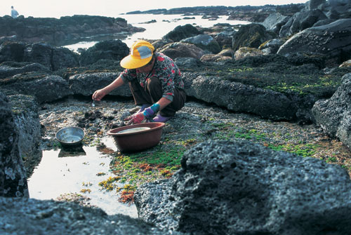 יונגהאומא היא בת 65, נשואה, אם לארבעה ילדים וסבתא לשבעה נכדים. היא צוללת כמעט חמישים שנה. יונגהאומה היא אחת מ"הנשים של הים", הֵיְניוֹ (Haenyo) – נשים צוללות בקוריאה הדרומית, הממשיכות מסורת של יותר מ־1,500 שנים. "הנשים של הים" הן מעמד בפני עצמו. רק נשים עוסקות במלאכה קשה ומסוכנת זו, שהחלה בשליית פנינים בדרום יפן ובקוריאה הדרומית ושעד המאה ה־17 עסקו בה גם גברים. כיום זהו עולם הולך ונעלם. באי נותרו כעשרת אלפים צוללות (לשם השוואה, בשנות השלושים היו כ־23 אלף כאלו), וקרוב לוודאי שזה הדור האחרון שלהן. בנותיהן כבר לא עוסקות במלאכה קשה זו. הזמנים משתנים. האמהות והסבתות עבדו קשה כדי שלדור הצעיר יהיו חיים אחרים. מרבית הצוללות דוחפות את בנותיהן ללימודים, למציאת עבודה בעיר ולחיים מודרניים. צ'ז'ו־דו (Cheju Do), אי קטן כ־85 קילומטרים מדרום לקוריאה הדרומית, נחשב למרכז העיקרי של "הנשים של הים". כששמעתי לראשונה על המקום ועל הנשים, ידעתי שאני חייבת להגיע לשם עם מצלמה. רציתי להגשים חלום ישן: לחיות במשך תקופה במקום אחר ולתעד עולם אחר. ידעתי שצ'ז'ו־דו הוא המקום בשבילי. לקחתי פסק זמן של חודשיים מחיי הרגילים, ממשפחתי ומעיסוקי ויצאתי לקוריאה הדרומית. שכרתי חדר אצל משפחת סו בכפר קוסאן, בחוף הדרום־מערבי של צ'ז'ו־דו: סוֹ צ'וֹנג סוּ, מורה לאנגלית (ודובר האנגלית היחיד בכל המחוז), ואשתו מוּן סוֹנג צָ'ה, בעלת חנות קטנה לקוסמטיקה וללבני נשים. אמו של מר סו היתה אחת הצוללות הקשוחות והטובות בכל המחוז. היא צללה עד לפני שלוש שנים. כיום היא בת 76. עולם לנשים בלבד סוֹ לוקח אותי לפגוש את הנשים. אנחנו נוסעים בשבילי עפר, שחוצים את השדות בין קוסאן לכפר הסמוך הנג'ה (Hanga). ריבועים ירוקים וחומים, שעכשיו, בעונת הקטיף, מדיפים ריח חריף של שום. שדות תפוחי אדמה, מים בוהקים ומנצנצים בין שתילי האורז. השביל מתעקל לצוק גבוה וגולש בחדות לים. בצד הדרך שלט קטן, שמודיע שזה החוף של נשות הכפר הנג'ה. בכפרים לכל אורך החופים של האי מקובצות נשים הצוללות למחייתן. לכל קבוצה טריטוריית חוף ותחום צלילה משלה. הקבוצה שאני עומדת להצטרף אליה, זו של יוּנְגְהאוּמא, צוללת יחד כבר יותר מארבעים שנה. מקצה הצוק נפרשים מרחבי הים. מדרגות אבן מובילות למטה, לחוף מפורץ שבו סלעי בזלת רבים. ליד הסלעים בקתה מאבני בזלת, המשמשת מעין "מועדון צלילה". בכניסה יושבות כמה נשים. סוֹ עורך בינינו היכרות. פניהן גסות וחרושות קמטים של רוחות, שמש וים, חיוכן חם וכן. הן מקבלות אותי בחום וב־סקרנות. יונגהאומא מנהיגה קבוצה של שמונה צוללות מהנג'ה, כפר קטן של כשישים משפחות, המתפרנסות מחקלאות ומצלילת הנשים. כיום נותרו בכפר רק כעשרים צוללות. יונגהאומא, קטנה, נמרצת וחזקה, מנהלת את כל ענייני הקבוצה: היא אשת הקשר עם איגוד הדייגים והאחראית לגביית הכספים בעבור התוצרת הימית, לחלוקת הרווחים לנשים בקבוצה, לתעודות רפואיות ולשאר עניינים בירוקרטיים. לאט לאט מצטרפות נשים נוספות. זהו עולם סגור של נשים בלבד, ויש תחושה של קִרבה גדולה ביניהן. כל אחת מביאה עימה קצת אוכל, שבו הן מתחלקות: תפוחי אדמה, לחמניות עם שעועית אדומה, פירות. הן מניחות את האוכל במרכז, מפטפטות וצוחקות, מנסות לשתף אותי. אנחנו מתחילות בתקשורת ידיים ולב ומבינות הרבה. תוך כדי אכילה ופטפוט הן עוסקות בתיקונים קטנים לחליפת הצלילה, בהשחזת הסכין או בחיזוק החבלים והסל הצף. מגיע הזמן להיכנס למים. הן אוספות את ציודן הפשוט: מסכת גומי דהויה עם שתי רצועות דקות וחגורת משקולות מתכת משופשפת. בחגורה תקועה סכין מעוקלת, לכמה מהן גם מוט במבוק וקלשון מחודד בקצהו. כולן מצוידות בסל הצף, שלתוכו יאספו את שללן. זהו סל רשת ארוג, שמחובר לחישוק עץ ולכדור קלקר המשמש כמצוף. בעבר נעזרו בדלועים ככלי ציפה לשעות הארוכות בים. עד לפני כשישים שנה צללו הנערות עד גיל בגרות עירומות למחצה. אחר כך עברו לבגד כותנה קצר, מבדים שטוו בעצמן. רק ב־15־20 השנים האחרונות החלו להשתמש בחליפות צלילה מודרניות יחסית, שמאפשרות ל