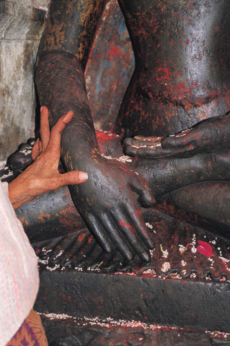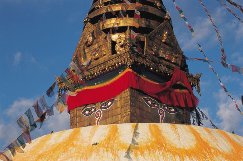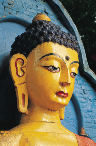 חגיגות יום ההולדת של בודהא בעמק קטמנדו, נפאל, החלו לפנות בוקר. אלפים צעדו במעלה גבעה תלולה בדרכם אל מבנה מקודש, נושאים בידיהם נרות, קטורת ומנחות. בהגיעם לרחבת המבנה הצטרפו המאמינים אל ההמון שכבר הקיף אותו בכיוון השעון. באיזור זה של העולם מקיפים את המבנים המקודשים כך שיד ימין, זו שאינה  | פסל של בודהא בעלייה לגבעת סוויאמבהונאת. אל לנו לטעות בארשת פניו המנומנמת. כמי שהגיע לנירוונה, מופיע הבודהא לא אחת כמי שלסביבה אין כל השפעה עליו והוא שקוע בתוך עצמו. האוזניים המוגדלות הן אחד מ-75 סימנים המופיעים על גופו. תנוכי האוזניים המנוקבים הם עדות לעדיים שהסיר מעליו בודהא, כשעזב את ארמון הולדתו ויצא לדרך החיפושים |