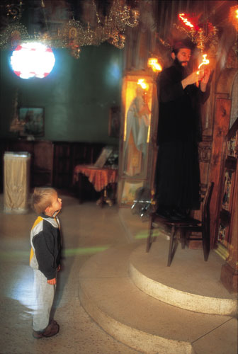 בלילות קיץ ארוכים. כדי לדמיין זאת אני נזכר באירינחוש, שהראה לי את החבל שתלוי על עץ מעל מי הכנרת וסיפר שמחבל זה הוא מזנק אל המים כשהגלימה השחורה וחום הכנרת נעשים בלתי נסבלים. באותם ימים קסומים חגגו נזירי כפר נחום את יום הטבלתו של ישוע בירדן בטקס מרשים על גדות הכנרת, ליד כנסיית כפר נחום. צלב מקושט שהוכן מבעוד מועד נזרק עמוק אל תוך מימיו הקפואים של האגם, ובעקבותיו זינקו אל המים האמיצים שבגברי הקהילה הנוצרית הגדולה והתחרו ביניהם על הכבוד שניתן למי שמגיע ראשון אל הצלב ומחזירו אל בכיר אנשי הכנסייה במקום. לפני הטבילה, בזמן הטבילה ואחריה מתאחדים כולם בשירה שמהללת את האל, נזירות ביישניות מצרפות את קולן לבריטון הנזירים ומגישות ארוחה משובחת לנוכחים. חלפו להן 1,400 שנה, ונזיר אחד חי לבדו בכפר נחום. כבר 11 שנים חי אירינחוש במקום, ואולי חלפו בראשו צהלות הנזירים שפסו מכאן – הפרסים טבחו אלפי נזירים בעת כיבוש הארץ, הרסו כנסיות ומנזרים רבים, והכנסייה היוונית אורתודוקסית בכפר נחום נבנתה שוב רק לפני כשבעים שנה – כשהחליט לחדש את המסורת בכפר נחום. בכל זאת, בעיני הנוצרים כפר נחום אינו סתם עוד מקום בארץ ישראל, אלא "עירו של ישוע". לפי המסורת, כאשר עזב ישוע את נצרת בא לכפר נחום, וכאן בחר את 12 שליחיו. שלוש שנים מלאו להחלטת אירינחוש, והמסורת קמה לתחייה: בכפר נחום שוב חוגגים אפיפאני – יום התגלות האלוהים, יום קדוש. כאלף איש, ערבים תושבי הכפרים בצפון ויוצאי מדינות חבר העמים מגל העלייה של שנות התשעים, מחליפים את בני כפר נחום הנוצרים בתור קהל המתפללים. רק אחד מהם, שנבחר מראש, מזנק אל המים, מושיע את הצלב מן הקור ומגישו למטרופוליטן של נצרת לקול מחיאות כפיים ומברוּּכּ מהכרוז שמלווה את הטקס. ההווה מחוויר תמיד לעומת העבר. לקח חשוב למדתי מאירינחוש על הרוגע של אדם המתכונן מראש למשימותיו בחיים. די היה להתבונן בו במשך כמה דקות בערב שלפני הטקס, מוזג יין אדום (בוז'ולה מן המעולים שטעמתי) שהגיע אליו בדרך לא דרך ממנזר קטן ליד ג'נין בבקבוקי פלסטיק של ליטר וחצי ומספר בשבחו, ומיד נתפסים בשלוותו. במטבחו הומה לה משפחה אוקראינית. נשותיה מכינות מאכלים מסורתיים של יום קדוש, גבריה עמלים על דגלי התהלוכה שבה תצעד הקהילה למחרת. אירינחוש, לקראת סוף שנות השלושים לחייו, מתיישב על רצפת הסלון של בית הגרניט, מזהיר את עצמו בקול רם לא לשתות יותר מדי מהיין, בוחן ומאשר את הדגלים המובאים לו ולא נראה מוטרד כלל מסערת האנשים הצפויה לו למחרת. ואני, במוחי הזדוני, כבר מזהיר אותו. שהרי על מה ירכלו מחר זקנות העדה, ובמה יעסקו ראשיה ועמיתיו הנזירים אם לא בכישוריו של אירינחוש כמארח הטקס הגדול: האם נגזמו כל העצים? האם נוקתה השעווה ממנורות הכנסייה? האם נתלו כל הדגלים כראוי ונשלחו אנשים ומכוניות לאסוף את נכבדיה וקשישיה של העדה? האם תגיע הספינה שתארח את ראשי הכנסייה במועדה אל הרציף הקטן? אריגי זהב על ספינת תפילה חיכיתי לו עם עלות השחר על שבת החג, כי סיפר לי בערב שמשימתו הראשונה היא להאיר את כל נרותיה של הכנסייה לפני בוא האורח הראשון, נזיר שבא בשבע בבוקר ומתחיל את  | הנזיר אירינחוש מדליק את נרות הכנסייה בבוקר הטקס. לפני בוא האורח הראשון. צופה בו אחד מילדי הקהילה היוונית האורתודוקסית, הילד ניקיטה בן החמש |