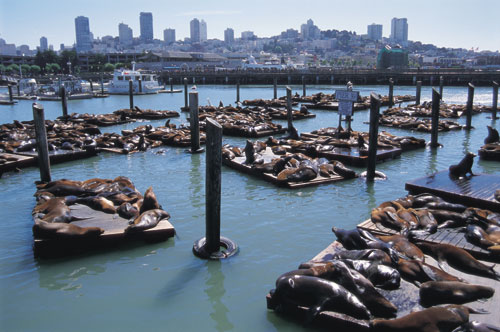 מה הקשר בין ההיסטוריה של קליפורניה לבין היונקים הימיים החיים לאורך חופיה? מתברר כי אירועים שונים בתולדות המדינה התרחשו בגלל הימצאות בעלי החיים האלה כאן, וכיווני התפתחות צפויים השתנו כאשר אותם בעלי חיים נטבחו ונעלמו. במאה ה־18 היו שתי תנועות חדירה של אירופאים לאיזור: מצפון הגיעו ציידי פרוות רוסים בחיפוש אחר פרוות של יונקים ימיים, שהיו שרועים באלפיהם, בלא חשדנות, לאורך החופים. מדרום הגיעו הספרדים, מגלי האיזור. מחשש לאובדן השליטה במרחב, הם החלו לבנות לאורך החופים מאחזים בדמות תחנות מיסיון, מרכזים דתיים, צבאיים וחקלאיים (ראו כתבה בעמ' 112). לכאורה, צפוי היה שתתפתח בקליפורניה אוכלוסיה דו לשונית – דוברי שפתם של טולסטוי ופושקין בצפון, ודוברי שפת סרוונטס ולורקה בדרום, אבל תאוות הבצע של ציידי הפרוות לא ידעה שובע. הם טבחו ביונקים הימיים, עד שכמעט הביאו להכחדתם. כשהתמעט השלל, חזרו צפונה על עקבותיהם ושבו לאמא רוסיה. ההמשך ידוע: מהגרים הגיעו ממזרח, בדרכי היבשה והים, וקליפורניה הפכה למדינה דו לשונית, שבה מספר דוברי האנגלית שווה למספר דוברי הספרדית. אוכלוסיות יונקי הים הקליפורניים לא שבו לקדמותן מאז, אך אמנות בינלאומיות מגינות עליהן, והן הולכות וגדלות באיטיות. הפרווה הצפופה בעולם לוטרת הים (Enhydra lutris), מסדרת טורפי היבשה, היא חיה חביבה, המוכרת בתנוחת הציפה שלה – על הגב. לעיתים היא מניחה אבן על בטנה כסדן, ומרסקת עליה צדפות שהיא שולה מהקרקעית. פרוותה היא הצפופה ביותר בעולם החי – כ־160 אלף שערות בסנטימטר רבוע – ולכן היה לה ביקוש עצום, שהביא אותה לסף הכחדה. ממאות אלפים שרד גרעין קטן, שהיה בסיס לשיקום המין. היום הלוטרה הימית מוגנת ומצליחה להתרבות באיטיות. אריות הים (ממשפחת Otaridae) וכלבי הים (ממשפחת Phocidae) – שתי המשפחות השייכות לסדרת הטורפים הימיים Pinnipedia – דומים במראם החיצוני. אבל אריות הים  | אריות ים קליפורניים בסן פרנסיסקו. תיירים רבים מגיעים כל השנה כדי לצפות באריות הים השרועים על משטחי העץ במזח 39 צילום: דביר בר-גל |