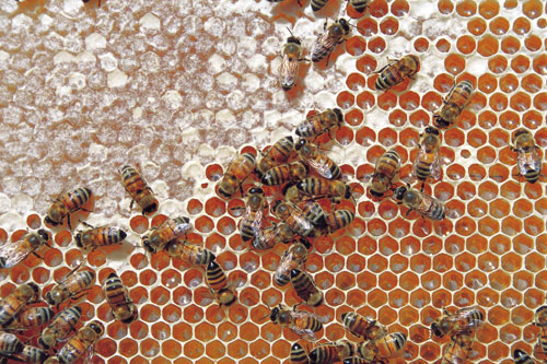דבורים וחלת דבש. החלה בנויה מתאים משושים שיוצרים מבנה סימטרי וממלאים את השטח בצורה מושלמת. משושה הוא הצורה החסכונית ביותר מבחינת היחס בין ההיקף לנפחו | צילום: שי לוי |