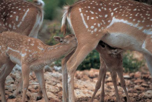 העופרים הצטופפו יחדיו, יונקים מכל יחמורה חולפת, בין שזו אמם או אחת מחברותיה. החברותא של גן הילדים טובה לעתות שלווה, אך אם משהו מבהיל אותם, מיד רץ כל עופר אל אמו |