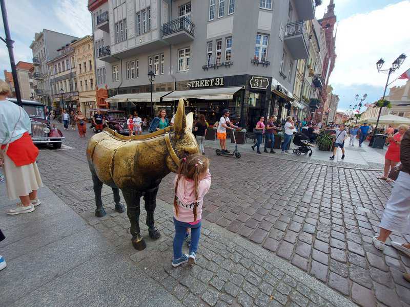 כיכר השוק בעיר העתיקה. למעלה: בית העירייה ופסל קופרניקוס, למטה: פסל של חמור שגבו וראשו מבריקים מהליטופים הרבים שהוא זוכה להם
