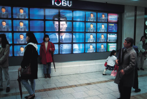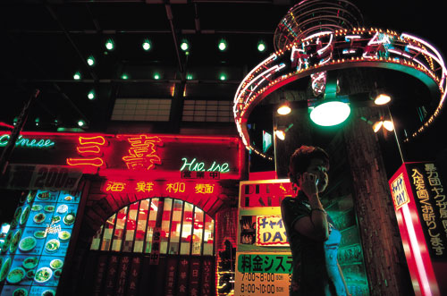בדוכן מאולתר זכה מיד להתעניינות סוערת. כך, למשל, בקיץ 1998 עמד גבר צעיר מאחורי דוכן רעוע בכניסה לרחוב בילויים ברובע שיבויה (Shibuya) והציע התקנה מיידית של הולוגרמה במסך של מכשיר הטלפון הסלולרי, לפי בחירת הלקוח. מאחורי הדוכן השתרך תור ארוך של אנשים, שהחזיקו מכשירים בשווי מאות דולרים. בעל הדוכן לקח ביד בטוחה את המכשיר, פירק אותו מאחורי קופסת קרטון עלובה כאילו היה קוסם בקרקס רחוב צועני, והחזיר אותו כעבור דקות מספר עם מסך מואר מעוטר בהולוגרמה. במקום אחר הציעו לצייר בעזרת מחשב על דגמים מסוימים של טלפונים סלולריים גוני הסוואה צבאיים, חוף טרופי עם דקלי קוקוס באור שקיעה, דולפינים קופצים מהים ועוד מאות דוגמאות, כיד הדמיון הטובה, לפי דרישת הלקוח. אני מעודכן, משמע אני קיים נהוג להסביר את התופעה התרבותית היפנית של צרכנות בזבזנית על מוצרים לא הכרחיים בכך שביפן מאז שנות השבעים, "אתה מה שאתה קונה". אולם לא פחות מלגיטימציה תרבותית לבזבז, השוק הסלולרי הוא ביטוי ללגיטימציה תרבותית לשחק – משחק באמצעות צריכה. בדומה למוצרים אופנתיים אחרים, הפכו טלפונים סלולריים ביפן במה לביטוי עצמי ולהצגה עצמית ויצרו צורות חדשות של תקשורת דרך משחק. בכמה סקרים שנערכו בשנים האחרונות נמצאה ירידה בסכומי הכסף שבני נוער מוציאים על משחקים ועל בילויים. רבים מהם, התברר, מעדיפים להפנות את התקציב למימון הרגלי הצריכה שלהם הקשורים בטלפונים הסלולריים שברשותם. המשוואה בין טלפונים סלולריים למשחק אובחנה על ידי Tsuka, אחת מחברות הטלפונים  | | תחנת רכבת בטוקיו. הרחוב היפני מופגז במידע צרכני כמעט 24 שעות ביממה |