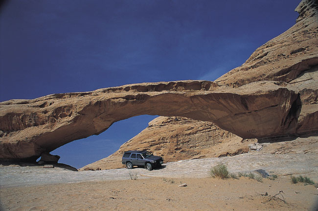 רוב הדרך היא בדרגת עבירות בינונית, בלי קשיים מיוחדים, והנסיעה מתבצעת בדרך כלל בשטח חולי לא טובעני. טיפוס קצר לסיק אל־בארה (נקודה 8 בתיאור המסלול) דורש זהירות. הדלק זול מאוד בירדן (כשליש ממחירו בארץ), ואיכותו גבוהה, אולם אי אפשר להשיג בירדן דלק נטול עופרת. ביציאה הצפונית מעקבה יש תחנת דלק, ואחת נוספת נמצאת בקצה הדרומי של הכביש הפנימי בעיירה אל־קווירה. לאורך הכבישים יש מוסכים ופנצ'ריות. הניווט יתבצע בנקודות ציון (נ"צ) לפי רשת U.T.M (סימון רשת בינלאומי). המסלול מורכב משני קטעים, המופרדים זה מזה על ידי פסי הרכבת ועל ידי כביש רשידייה־דיסה: א. בקטע הדרומי (נקודות 1־13) נכללים בין היתר ואדי יתם אל־עמרן, ג'בל אום־עש, ג'בל אל־קטר, סיק אל־ח'זעלי, סיק אל־בארה, ואדי אום־עישרין. ב. הקטע הצפוני (נקודות 14־19) כולל ביקור ב"הר הקשתות" (תל אל־ח'רזה), וסיומו בכביש המהיר, כביש 15. המסלול כולו נמתח על פני כ־100 קילומטר. הרי גרניט משוננים (1) נ"צ 7065/2708 לפני הגשר, סמוך לאתר הארכיאולוגי פרסידיון, פונים מכביש 15 דרומה, אל כביש משני. לאחר כשני קילומטרים פונים מזרחה, ויורדים לעבר ואדי יתם אל־עמרן. נוסעים בוואדי הרחב בכיוון דרום־מזרח. בצידי הוואדי מתנשאים הרי גרניט משוננים וצבעוניים, העשויים שכבות אלכסוניות. חולפים ליד מחצבה, ולאחר מכן מתחת לקו מתח גבוה. אבן חול צבעונית (2) נ"צ 7105/2638 במפגש הוואדיות ממשיכים ישר (בכיוון דרום־מזרח). סביבנו משתרעים מישורי חול סחופים, הזרועים בעצי שיטה. מומלץ לנסוע בדרך העוברת ליד אחת הגדות, ולא בזאת שבמרכז הוואדי, הגדושה מהמורות וטלטולים. בצד הדרך יש גבעות אבן־חול צבעוניות, בתצורה שכבתית אופיינית. למרגלותיהן פזורות דיונות אדומות, שנוצרו מבליית הסלע. המיצר (3) נ"צ 7135/2622 נכנסים למיצר הרים, החוצה את ג'בל אום־עש. אל בורות המים (4) נ"צ 7159/2624 בצומת ואדיות פונים חדות בכיוון צפון־מזרח, בדרך מוסדרת המסומנת ברגמים (גלי אבנים), שחלקם צבועים בסיד. לאחר כארבעה קילומטרים הדרך סובבת מזרחה, ועוברת מצפון לג'בל אל־כרה, המתנשא מעל סביבתו. בהמשך הדרך מזרחה נחלוף ליד כמה בורות מים, שנכרו למרגלות ההרים. דרכנו ממשיכה בנוף מגוון של סלעי גרניט מחודדים והרי אבן־חול מעוגלים, מגווני צבעים. מעבר להרים ולבקעה (5) נ"צ 7288/2643 מדרון ומצוק (8) נ"צ 7395/2706 חולית (10) נ"צ 7425/2755 אשל לא למאכל (11) נ"צ 7400/2783 על פרשת דרכים (12) נ"צ 7379/2824 הנה באה הרכבת (13) נ"צ 7397/2838