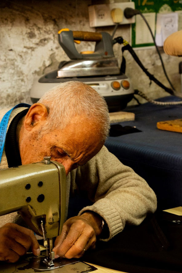את מוחמד פגשתי במתפרה שלו, באחת הסמטאות ברובע הארמני. הפשטות והצניעות שלו נגעו ללבי. מוחמד הוא חייט ירושלמי ותיק, אשר המתפרה הקטנה שלו עמוסת בדים ומכונת תפירה אחת. הוא שמח כשנכנסתי לחנותו וניאות להצטלם ולספר לי על המתפרה שלו.