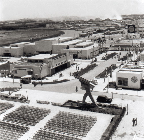 מתחם יריד המזרח ב-1936. כל ביתן נבנה על ידי אדריכל אחד אך כל המבנים היו שזורים בתבנית כוללת | צילום: רודי ויסנשטין, צלמניה פרי-אור |