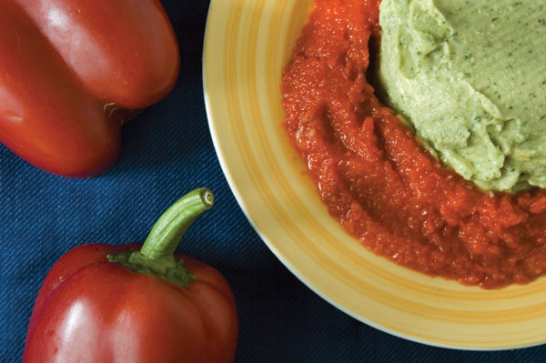 כוס יין אדום 2 כפות סוכר חום 1/3 כוס עלי נענע (ללא הגבעולים). אפשר להמיר בכף עלי מנטה יבשים ומפוררים 2 שיני שום גדולות כתושות 3 כפות שמן זית כף גדושה דבש ליטר יוגורט עיזים או כבשים (רצוי סמיך) מלח ופלפל לפי הטעם הכנה: בסיר בינוני מניחים את פרוסות הסלק, הסוכר והיין. מוסיפים מים עד לכיסוי, מערבבים, מרתיחים ומוסיפים לבשל על אש נמוכה עד לריכוך הפרוסות (כ- 10 דקות). מסננים את הנוזלים, מניחים להצטנן ומעבירים לטחינה במעבד מזון עם שאר המרכיבים, עד להשגת מרקם אחיד. טועמים ומשפרים את התיבול. מגישים קר. אפשר לקשט בכף יוגורט סמיך מעוטר בעלי נענע קצוצים. פירה עשבי תיבול על מצע רוטב פלפלים (4 מנות) טעים! טעים! טעים! מצע רוטב הפלפלים הוא ממרח רב שימושי, הקל ביותר להכנה שפגשתם, ואפילו שומר על ערכים תזונתיים גבוהים (לכן הכמות שתקבלו גדולה מהנדרש למתכון). לפירה: 4 תפו"א גדולים, קלופים וחתוכים לקוביות קטנות 4 כוסות מלאות בעשבי תיבול קצוצים (כוסברה, פטרוזיליה, עירית או בזיליקום) 4 שיני שום 4 כפות צנוברים קלויים קלות 8-7 כפות שמן זית 2-1 כפות חמאה (לא חובה) פלפל ומלח לפי הטעם למצע הפלפלים: 1/2 ק"ג פלפל חתוך לקוביות 4 שיני שום כתושות 1/2 כוס כוסברה (אפשר להמיר בפטרוזיליה) 1/4 כוס שמן זית מספר טיפות טבסקו (לא חובה) מלח ופלפל לפי הטעם הכנת הפירה: מכניסים את קוביות תפוחי האדמה לסיר בינוני. מוסיפים כוס מים, ומביאים לרתיחה. מכסים ומוסיפים לבשל על אש נמוכה עד לריכוכם המלא (אם המים מתאדים לפני הריכוך, מוסיפים מעט מים). במעבד מזון עם להב מתכת טוחנים את עשבי התיבול, הצנוברים, השום והשמן. למחית דמוית הפסטו שנוצרת מוסיפים את קוביות תפוחי האדמה ומעבדים קלות. מתבלים במלח ופלפל. הכנת מצע הפלפלים: טוחנים את כל הרכיבים (למעט השמן) במעבד מזון, עד ליצירת מחית אחידה. מעבירים את הרסק למחבת ומעבים אותו, תוך ערבוב, עד להתאדות רוב הנוזלים. מוסיפים את שמן הזית למספר שניות ומסירים מן האש. הצעת הגשה: ליצור ספירלה בעזרת הרוטב על גבי צלחת שטוחה, ובמרכזה לעצב מגדל פירה דחוס, מעוטר באחד מעשבי התיבול. סושי אבוקדו ואורז מלא (4 מנות) המתכון דורש אמנם השקעה אך יתרונו בהיותו בריא במיוחד. ניתן לגלגל בתוך הסושי ירקות, רצועות דג נא, שרימפס או פטריות שיטאקי.