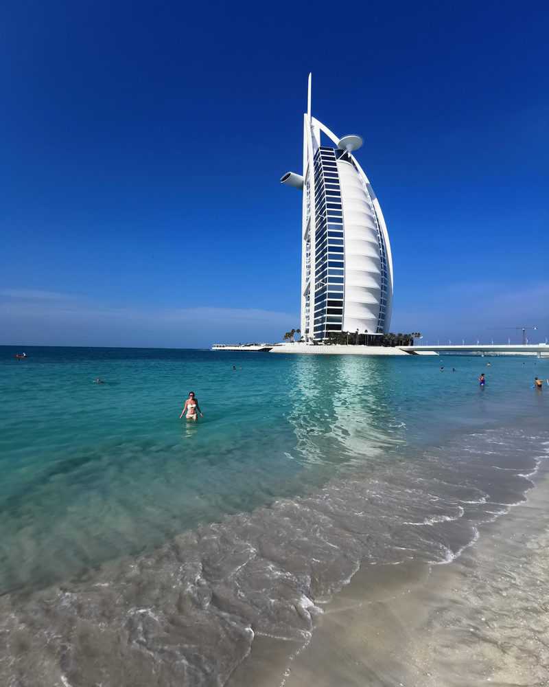 דבר ראשון חיפשתי את הזווית הכי טובה לצלם את מלון בורג׳ אל ערב. המבנה המדהים הזה שמדמה מפרש של ספינת דאו מתנשא לגובה של כ 300 מטר וממוקם ממש על קו המים של חוף הים של דובאי. עם השנים נבנו סביבו כל כך הרבה מבנים ויש באזור כל כך הרבה מנופים כך שאם אתה לא ממש מתאכסן במלון היוקרתי הזה אין כמעט סיכוי לצלם אותו נקי. אבל מצאתי פיתרון. בעזרת קצת עזרה מידידים בדובאי קיבלתי אישור כניסה לחוף אל נסים של מלון יוקרתי על קו החוף. משם היתה לי תצפית מושלמת על בורג׳ אל ערב ועל קו המים הכחולים.